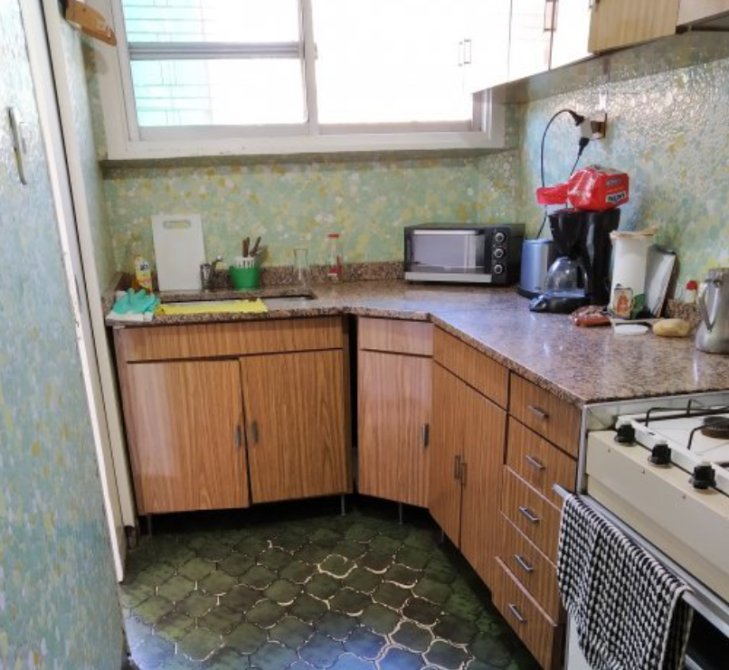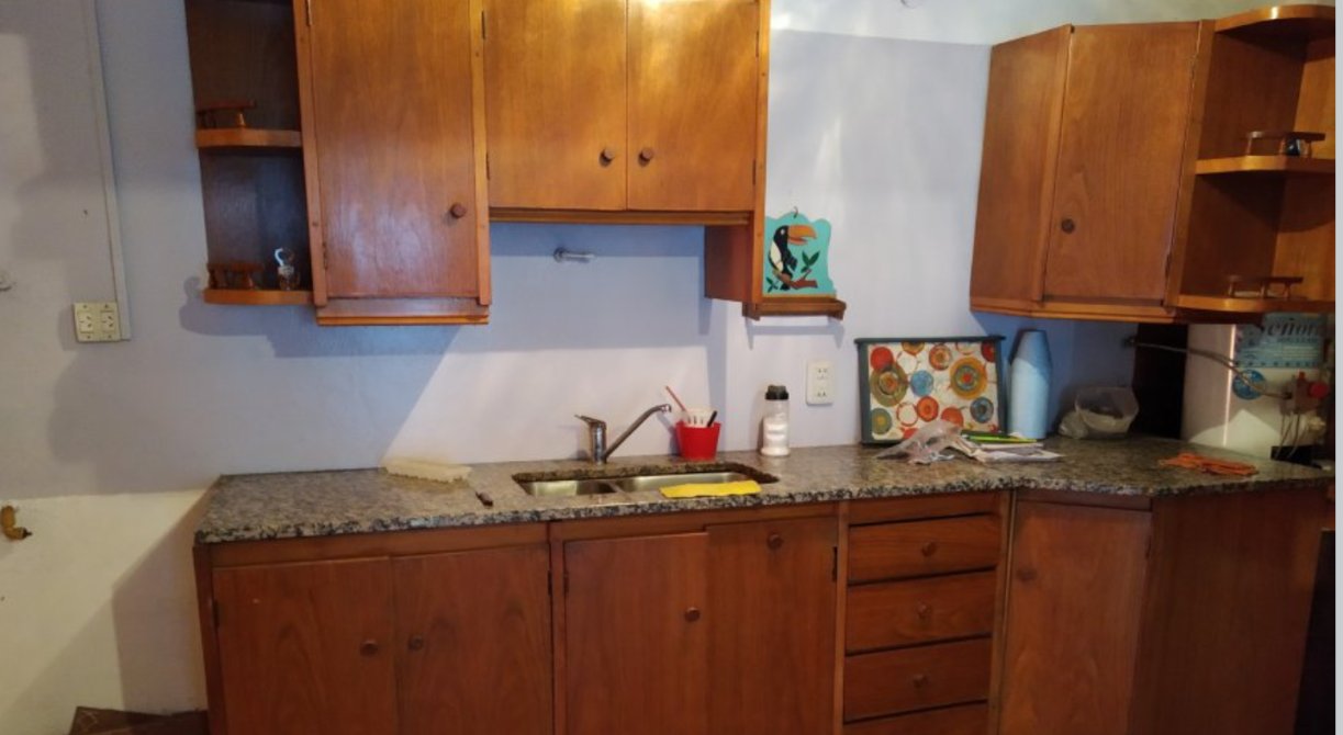 Cocina de 3 x 1,50 m con mesada de granito, bajo y sobremesada en fórmica, pisos cerámicos
